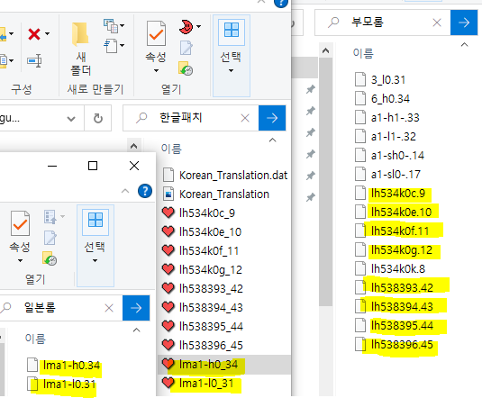 한글패치의 lh534k0c_9 ~ 45까지 8개 파일은 부모롬 노란색 칠한 동일한 이름에 한번씩 패치해주면 끝.